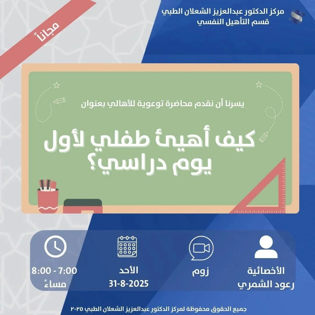 📣 يسر مركز عبدالعزيز الشعلان الطبي دعوتكم لحضور محاضرة توعوية مجانية عن طريق زوم بعنوان: